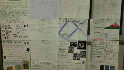 続いて2年生。ピカソ、葛飾北斎、新海誠(「君の名は。」の作者)、藤ちょこ(イラストレーター)などについて展示されていました。