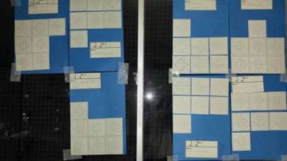 展示(C棟廊下)数学科は、「数学パズル」です。青色の台紙は1年生、ピンクは2年生です。