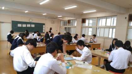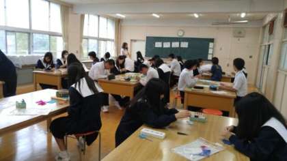 3年生家庭科の授業風景です。これは、「3学期実施予定の保育体験実習で付ける名札をフェルトを縫い付けて作る」というものです。家庭で糸と針を使う習慣はかなり減っているようでなかなか難しそうです。