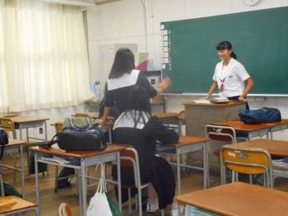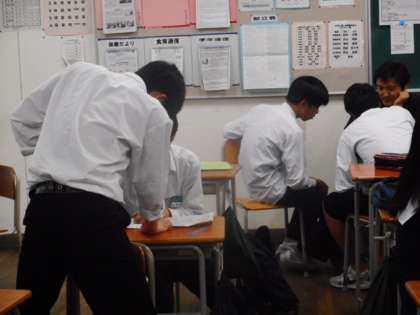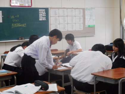 続いて3年生の様子です。1人で黙々と取り組む生徒、先生に教えてもらっている生徒、友達同士で教え合う生徒、また教卓に立ち友達に授業をしている生徒もいました。