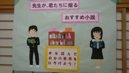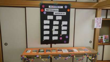 写真は、「3年生手作り絵本」と「先生が君たちに贈るおすすめの本」のコーナーです。「3年生手作り絵本」は家庭科の授業で作成したもので、ぜひ手に取って見ていただきたいと思います。