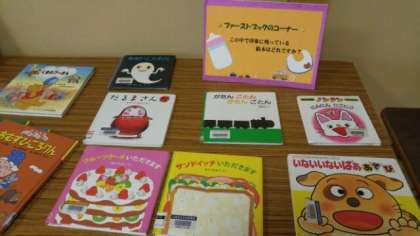 「絵本でよみがえる私の物語(乳幼児〜小学生向き絵本)」のうち、乳幼児向け「ファーストブック」のコーナーを紹介します。「いないいないばあ」や「ノンタン」などなつかしいですね。あとは、ぜひ和室で実物をご覧ください。