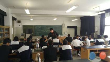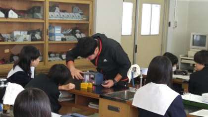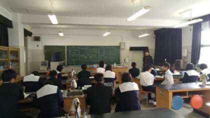 11月1日(水)の1限、2年生の理科室での授業の様子です。この日は、理科の研究授業でもあります。「水溶液に電流を流した時の変化」の実験です。