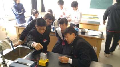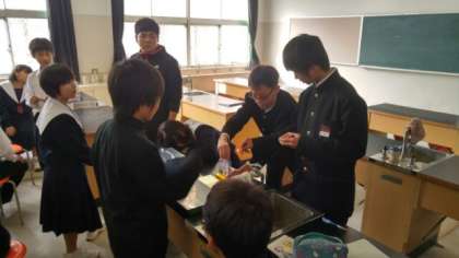 電気分解装置に水酸化ナトリウム水溶液を入れ、電気分解を行ったあと、陰極、陽極に発生した気体の性質をそれぞれ火を近づけることで確認します。火の付いたマッチを近づけるとあちこちでボン!という音が鳴ったり、線香を近づけると一瞬だけ火が大きくなったりしています。少し怖いながらも興味津々(しんしん)です。