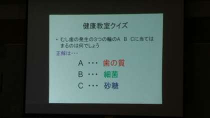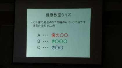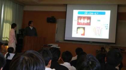 11月1日(水)5限、学校歯科医と歯科衛生士にお越しいただき、多目的室にて「歯と口の健康教室」を実施しました。パソコンを駆使し、クイズ形式の質問があったり、わかりやすく虫歯予防についてお話をしていただきました。