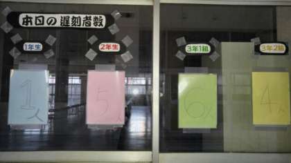 です。今日は合計16回となりました。上の数字は、8時30分までに欠席連絡が無かった場合、遅刻かもしれないということで遅刻とカウントしています。各学年、学級とも上の数字以上に頑張っています。