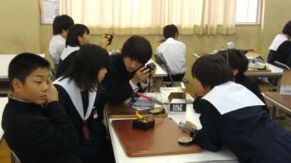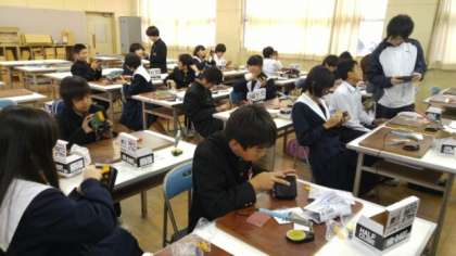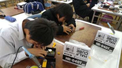 3限2年生技術の授業です。製図室でラジオ制作をしています。完成した生徒はラジオを鳴らして放送を聴いています。