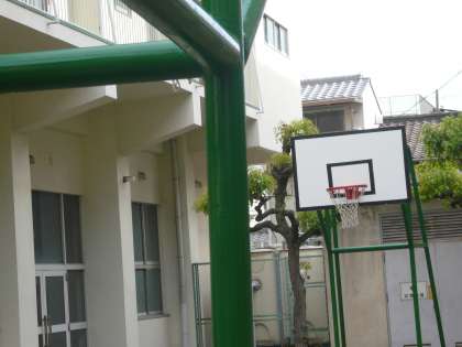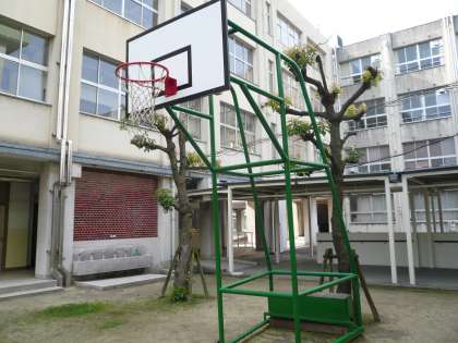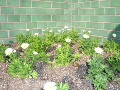 ※写真⇒雨天時に室内作業場で新たに作成したボードに付け替え,支柱に塗装を施したバスケットゴールと,ノースポールの苗を植えた正門横の花壇です。