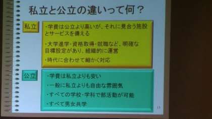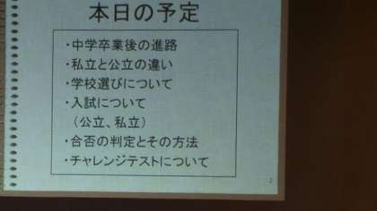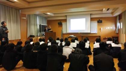11月30日(木)5限、2年生では多目的室で「進路講話」として、本校進路指導主事からの話を聴きました。1年生時に聴いた進路講話を受け、「私立と公立の違い」「入試について」などの説明、本校3年生からのメッセージもありました。「入試問題は、1,2年生時に習う範囲の方がよく出題されているので、今から意識して頑張るように」とのコメントもありました。