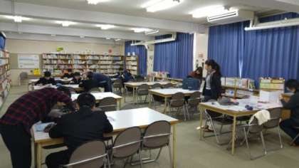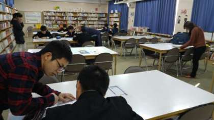 本日より28日(木)まで、冬休み中の自主学習の場として図書室を開放しています。これは、「こども生活・学びサポート事業」の一環で、校区小学校のサポーターさんや学校元気アップ本部事業の学習ボランティアさんの協力も得て実施しているものです。この写真撮影後も複数の生徒が登校し、勉強に励みました。冬休みの宿題を持ってきている生徒が多かったようです。あと2日、大いに利用してください。