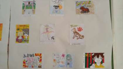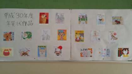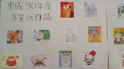 冬休みの美術の課題として全学年から提出された「手作り年賀状」のいくつかの作品を紹介します。