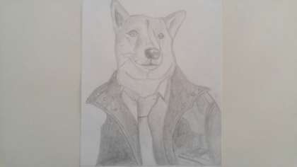 続いての3作品は犬そのものですが、1枚目の写真の犬はよく見ると、耳が鉛筆削りの削りかす!を張り合わせたもので作っています。また、2枚目の風呂敷内には「ドラえもん犬?」が見えます。3枚目は、皮ジャンで表情もばっちり決めています。