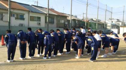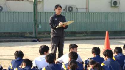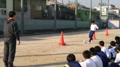 大きな声を出しながら準備運動をした後、挨拶。まず、サッカー部員によるインサイドパスのお手本です。