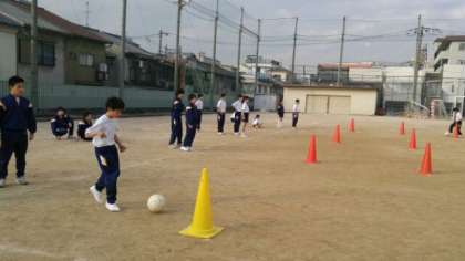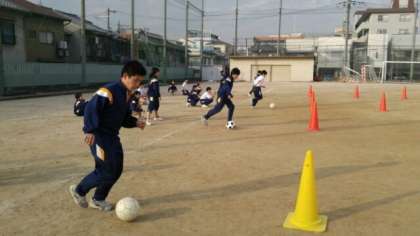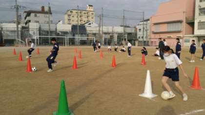 2人1組でのインサイドパスの練習、リフティング練習と続いた後、ドリブル練習です。これは、「5個のコーンを8の字に縫うようにドリブルをして向かいの人のところまで行く」というものです。4つのグループに分かれてリレー形式で競いました。1番手前のグループが1位になりました。