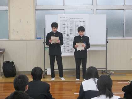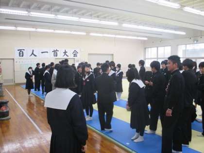 1月17日(水)5,6限、柔道場にて1,2年生合同「百人一首大会」が開催されました。大会は、図書部や国語係の生徒たちが中心になって進行されました。