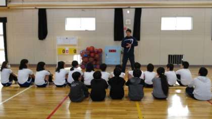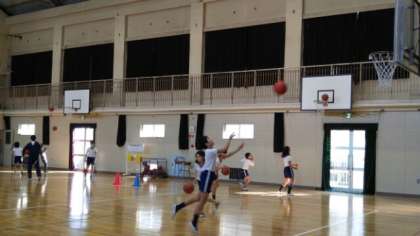 まずは、授業体験です。今回は、体育、理科、社会の3教科で実施しました。体育の授業は、体育館でバスケットボールをしました。すごく上手な児童もいました。