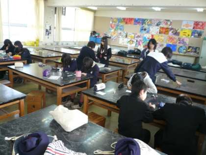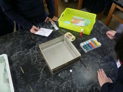 続いて美術室での美術部の様子です。水面にマーブリングインクを流し、水の流れでできた模様を染めたいものに写しとる技法(マーブリング)を試してみました。イラストを描いた画用紙を付けて模様を写し取りました。