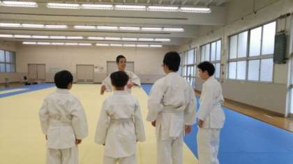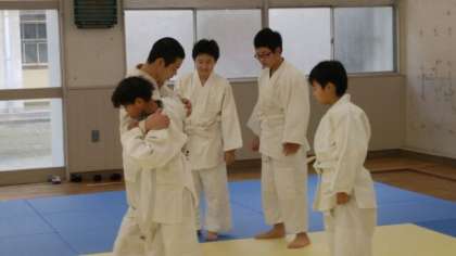 体育館1階柔道場では、柔道部の体験が行われていました。2枚目の写真は、小学生が顧問に大外狩りをかけるところです。寝技もしっかり決まっています。