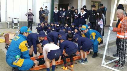 この小グループでは、中学生が被災者となって小学生が担架を持ち上げていました。