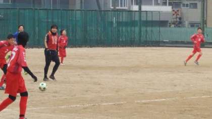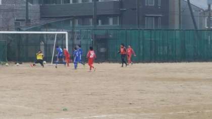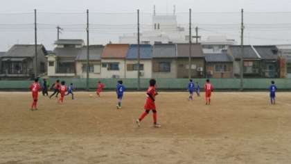 同じく10日(土)、グランドでは東中学校、難波中学校を招いて練習試合をしています。写真は、対東中学校戦の様子です。梅南中は赤色ユニフォーム(キーパーは黄色)です。