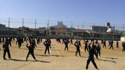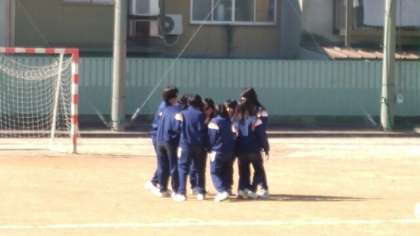 2月15日(水)5,6限、快晴の下、グランドで1,2年合同球技大会を実施しました。開会式の後、ラジオ体操をしてさっそく試合開始です。最初の4試合は、小さいコートで試合をします(ゴールはハンドボールのゴール)。Aコートで男子、Bコートで女子がそれぞれ同時に試合をします。