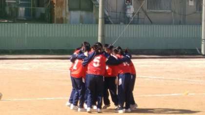 まずは、Bコートでの女子の1A(赤色ビブス着用)対2Aの写真です。試合前に円陣を組んで気合を入れています。