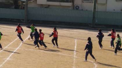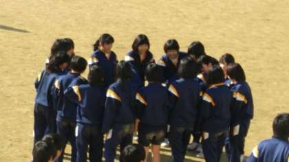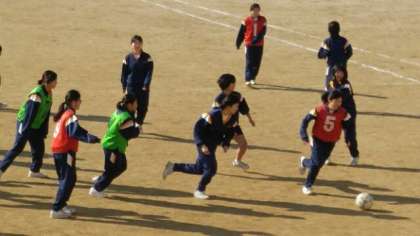 続いて第6回戦は、女子1年(赤色、緑色ビブス着用)対2年です。ここまで2年生女子は1年生女子に対して0勝3敗1分け、何としても一矢報いたいところです。試合開始前に円陣を組んで気合を入れ、ゲームスタートです。