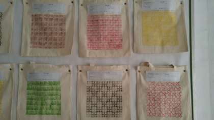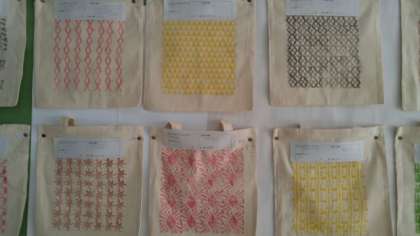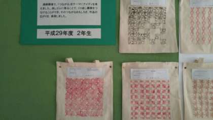 わずか3センチ四方が造る21センチ四方の連続模様です。つながることで個性的な模様が生まれていました。職員室の横に展示されていますので実物をぜひご覧ください。