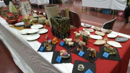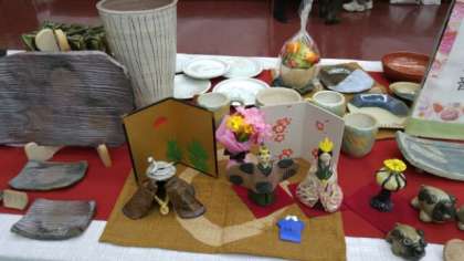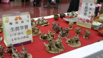 最後は、梅南津守地区の陶芸作品です。梅南津守小5年生のシーサー、干支の置物、ひな飾りなどが展示されていました。フラワーアレンジメントや陶芸作品など、素敵な作品ばかりでした。大勢の人でにぎわっていました。