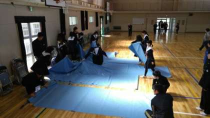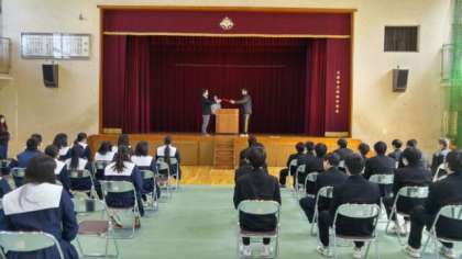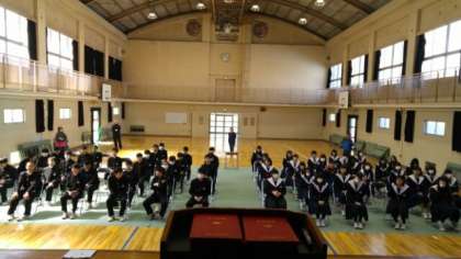 3年生卒業式練習終了後の様子です。練習を振り返って注意を聞き、教員の見本を見ました。卒業証書をもらった後の動きについての確認がありました。「今日の練習は、とても良かった」と先生から褒められていました。後片付けもさっさと終了、さすが3年生です。