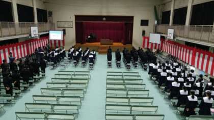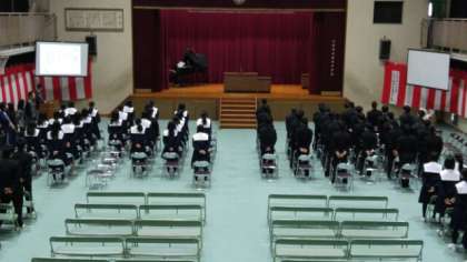 卒業生の入場が完了、在校生とともに予行を始めます。「開式のことば」「国歌斉唱」「市歌斉唱」「校歌斉唱」「学事報告」と続きます。今年の卒業生は、66名です。