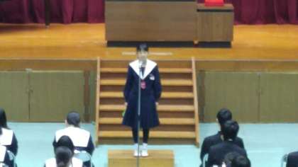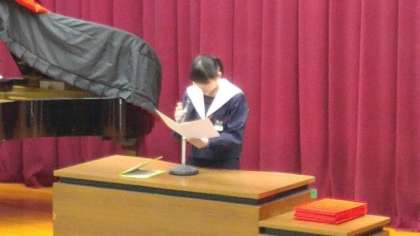 「学校長式辞」「PTA会長祝辞」「来賓紹介」「祝辞・祝電披露」の後、「在校生代表送辞」、「卒業生答辞」です。今日は予行なので、それぞれ一言だけで終わりました。
