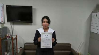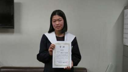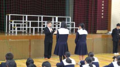 続いて、「読書賞」(西成区長より)です。これは、西成区内の中学生が年間で何冊の本を読んだかを報告し、特に冊数の多かった生徒に贈られるものです。1年生と2年生が受賞しましたが、それぞれ50冊超と約120冊!ということでした。これは、さすがに区内でも最多だったそうです。すごい読書量ですね。