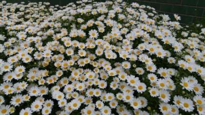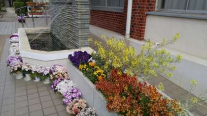 そんな中、玄関のノースポール(North Poleは、英語で北極点の事 3cmほどの中心が黄色の白い小ギク)がきれいに咲いています。3枚目の写真は、下に並べている花がサイネリア、上の手前赤色の花がリナリア、その奥黄色の長く伸びているのがハボタン(もともとキャベツのような形ですがこんなふうに伸びてくるようです)、その横黄色と紫色の花がパンジーです。