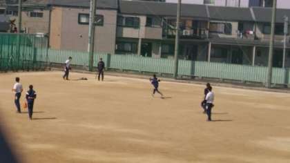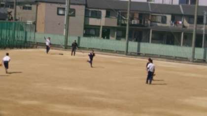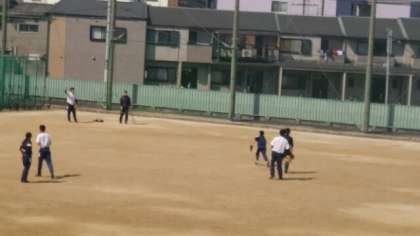 グランド南側では、野球部が練習しています。この写真を撮ったときは、3塁側のバント処理かボテボテのゴロを処理して1塁に送球していました。