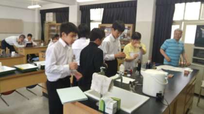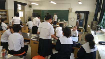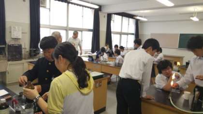 3枚目の写真右手では、試験管をガスバーナーで熱し、色の変化を確認しているところです。でんぷんのりにだ液を加えると糖に変化し、ベネジクト溶液を入れて熱すると黄色に変色するようです。