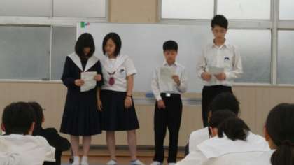 今日は、学級委員長からの連絡等の後、4人のスピーチがありました。一人目が選んだ漢字は「一」。選んだ理由は、「画数が少なく書きやすい」「人の名前にもよく使われている」から、とのことでした。もう一つ一画の漢字が紹介されていましたが、「乙」が思い浮かんだ人は少なかったのではないでしょうか。続いて、「生」。「自分の名前の中にある」「生きるは命につながる大切な言葉」とのことでした。