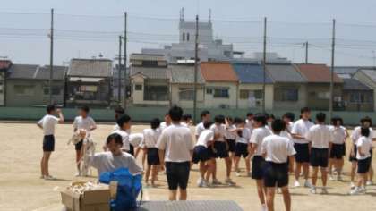 5月15日(火)4限、3年生体育の授業風景です。終了間際だったためほとんどの生徒が片付けに入っていましたが、女子のムカデ競走の練習は写真を撮ることができましたので紹介します。2枚目のグループは、バック!していました。