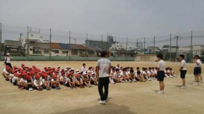 5月16日(水)、3限、梅南津守小5年生、松之宮小5年生を迎え、本校グランドにて、中学2年生との「小中合同50メートル走記録会」を初めて実施しました。