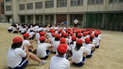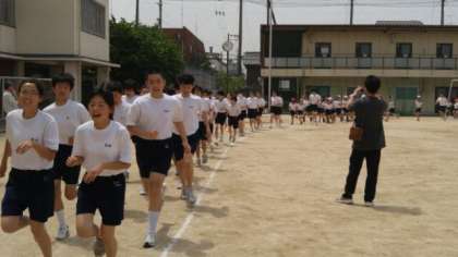 本校体育委員の紹介、体育委員代表挨拶のあと合同でグランドを1周走りました。
