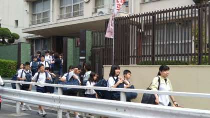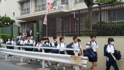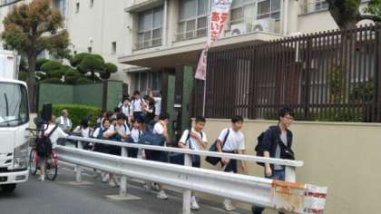 学校を出発しました。歩いて今宮駅に向かいます。
