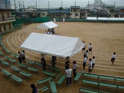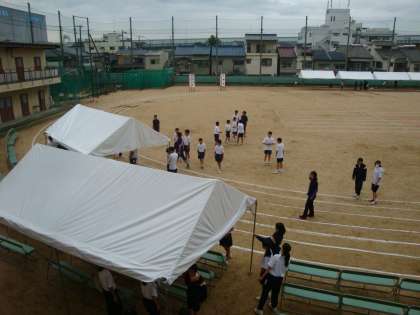 本日の体育大会は予定とおり行われますが、天候がやや心配です。保護者席にもテントを準備しています。子どもたちが朝から必死で準備してくれました。保護者の皆さん・地域の方々、ぜひとも応援に来ていただきますようお願いいたします。