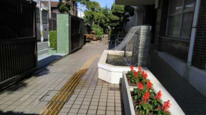 正門前のノースポールの白い花から、マリーゴールドに植え替えられています。また、2枚目写真の赤い花は、サルビアです。