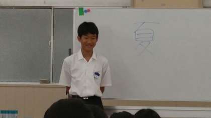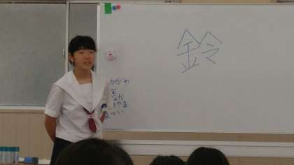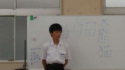 今日は、3人のスピーチがありました。一人目が選んだ漢字は「猫」。漢字の成り立ちや「大熊猫」は、「ジャイアントパンダ」のこととの説明もありました。続いて、「鈴」。選んだ理由は、「自分の名前に使われている」から、とのことでした。「鈴の音」の効果についても触れていました。最後は、「夏」。さすが、水泳部!ですね。