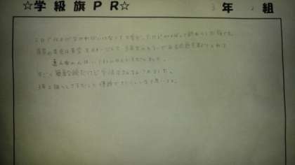 最後に3−2です。それぞれの学級旗が明日の開会式で見られます。ぜひ現物をしっかりとご覧ください