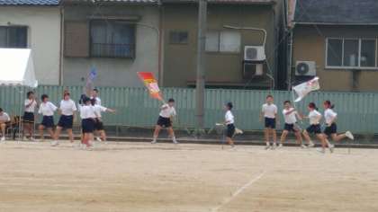 女子最後のリレー、400mリレーです。走る前、緊張の瞬間を迎えます。第1走者に声をかけるシーンが見られました。走者が前を走ると、学級旗がしっかり振られます。
