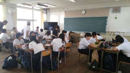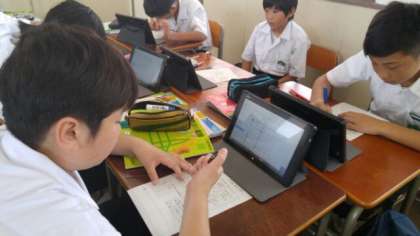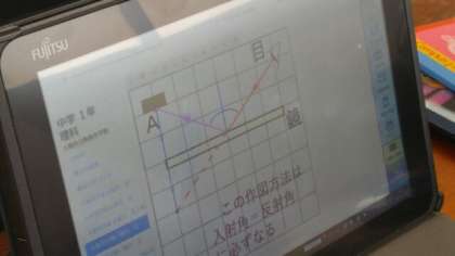6月25日(月)1限の1年生理科授業風景です。1人1台ずつタブレットを配布し、入射角、反射角などの学習をしています。