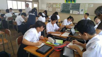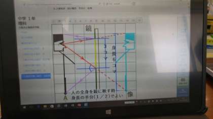 最終的に、「身長150センチの人が全身を見るために必要な鏡の大きさは?」について考えました。グループで意見を出し合いながら学習していました。