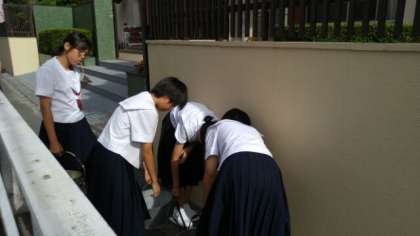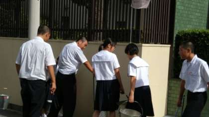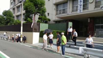 清掃時間は、8時5分から15分までの10分間。ちょうど登校途中の梅南津守小学校の児童や本校生徒たちが通る中での作業です。