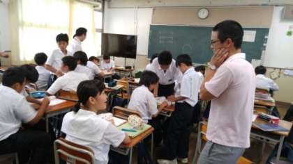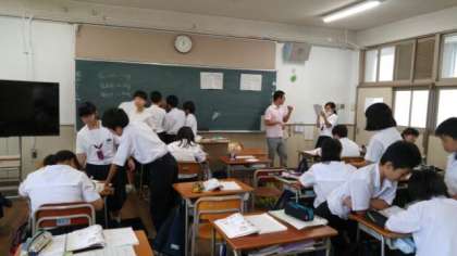 7月5日(木)4限の1年生数学授業風景です。「主体的・対話的で深い学び」の推進に向けた取組で、授業内に生徒同士の協働が取り入れられています。